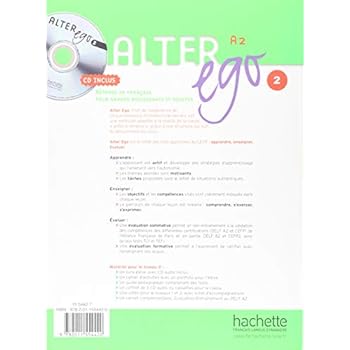 Structure :→ Apprendre :L'apprenant est actif et développe des stratégies d'apprentissage qui l’amènent vers l’autonomie.Les thèmes abordés sont motivants.Les tâches proposées sont le reflet de situations authentiques.→ Enseigner :Les objectifs et les compétences visés sont clairement indiqués dans chaque leçon.Le parcours de chaque leçon est linéaire : comprendre, s'exercer, s'exprimer.→ Évaluer :Une évaluation sommative permet un réel entraînement à la validation des compétences des différentes certifications (DELF A2 et CEFP1 de l'Alliance Française de Paris et, en partie, DELF B1 et CEFP2, ainsi qu'aux tests TCF et TEF).Une évaluation formative permet à l'apprenant de vérifier avec l'enseignant ses acquis.→ Existe aussi en version numérique.Descriptif : Alter Ego, fruit de l'expérience de cinq professeurs-formateurs de terrain,est une méthode sur quatre niveaux, adaptée à la réalité de la classe et « prête à l'emploi »,grâce à une structure qui suit le déroulement du cours.Alter Ego est le reflet des trois approches du CECR : apprendre, enseigner,évaluer.